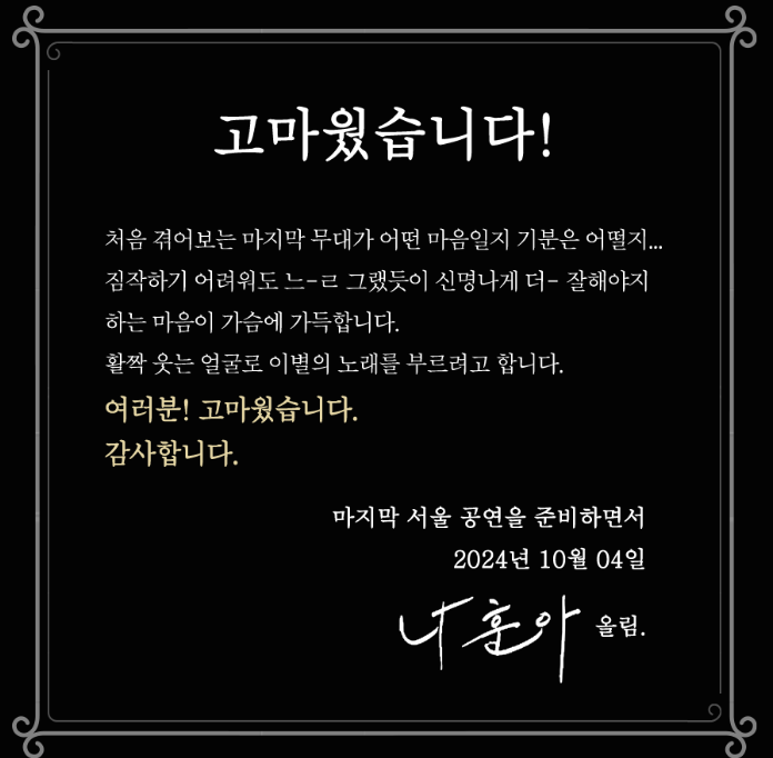 | 나훈아 ‘2024 고마웠습니다-라스트 콘서트(LAST CONCERT)’ 서울공연 예매 안내 (0) | 2024.10.08 |