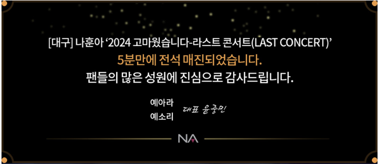 이번 콘서트는 나훈아님의 마지막 무대를 직접 볼 수 있는 소중한 기회입니다. 팬 여러분들의 많은 관심과 참여 부탁드립니다. 예매는 빠르게 마감될 수 있으니, 서둘러 예매하시기 바랍니다.