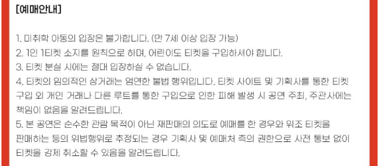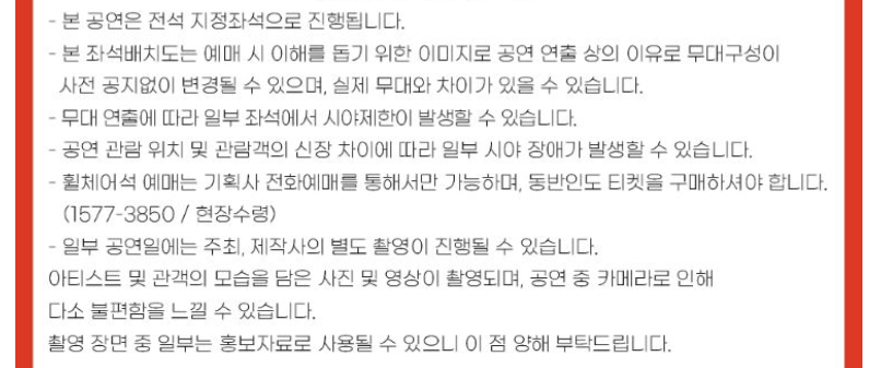 - 예매 유의사항: 티켓은 선착순으로 판매되며, 인기 있는 좌석은 빠르게 매진될 수 있으니 서둘러 예약하시길 권장드립니다.