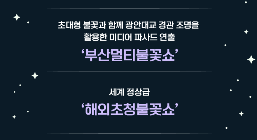 이번 축제는 부산항의 아름다운 풍경과 함께 다양한 불꽃놀이를 즐길 수 있는 좋은 기회가 될 것입니다. 놓치지 말고 빨리 예매하세요!