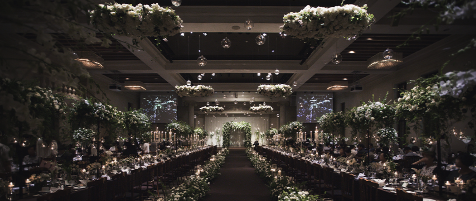 마제스틱 볼룸은 6.7m의 높은 층고와 스와로브스키 샹들리에가 돋보이는 화려하고 웅장한 공간으로 성대한 캐슬 웨딩을 꿈꾸는 신랑 신부를 위한 웨딩 베뉴입니다. 천년의 역사를 지켜오는 유럽의 고성을 완성한 부르고뉴지방의 석재와 베르사유 궁전으로 대표되는 바로크 양식의 앤티크 마감을 기본으로 지어진 마제스틱 볼룸에서의 캐슬 웨딩은 수 많은 셀러브리티가 선택한 명실상부 국내 최고의 하이엔드 웨딩이라 할 수 있죠. 🍽️