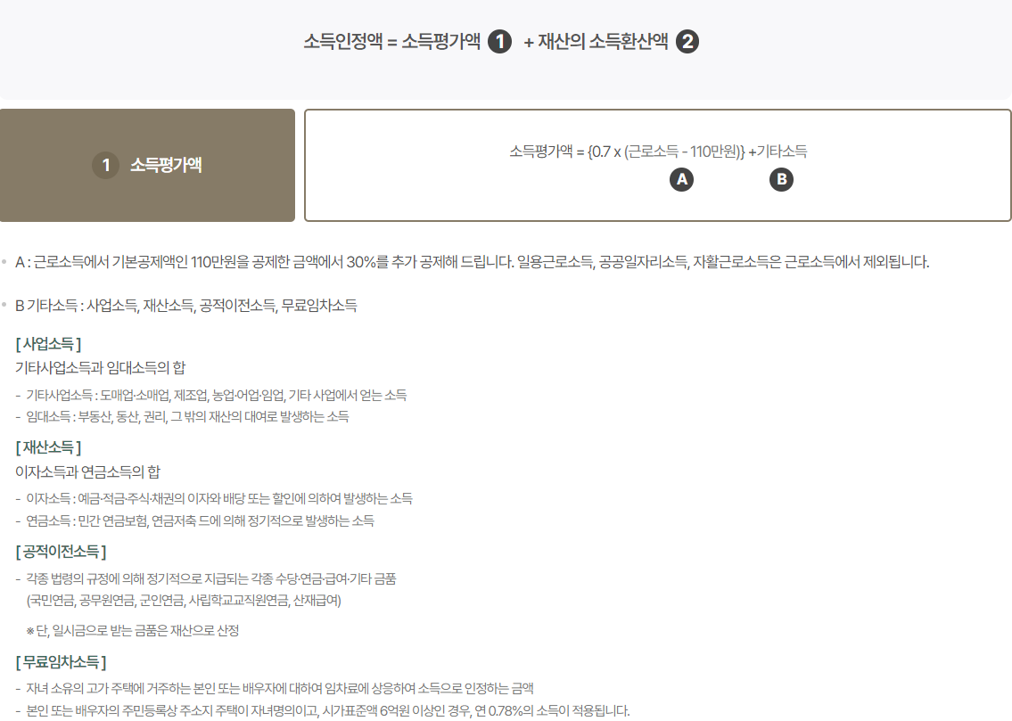 - ※ 소득인정액은 다음과 같은 방법으로 산정됩니다.