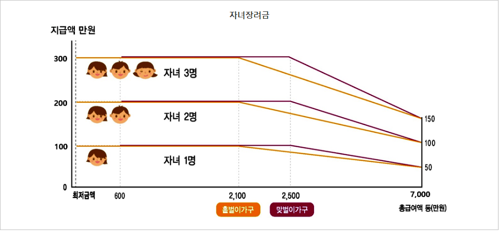 자녀수 | 최소 지급액 | 최대 지급액 |