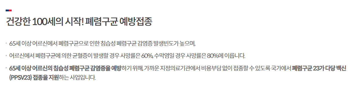 - 접종 방법: 전국 보건소에서 무료로 폐렴구균 백신 접종 가능.