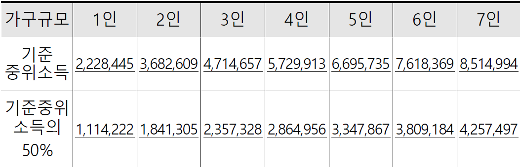 가구원 수 기준 중위소득 50%월 소득 기준(2024년)