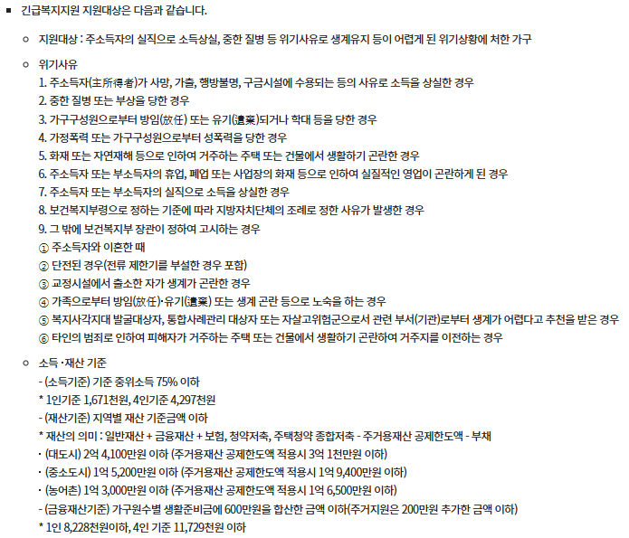 긴급주거지원의 대상이 되기 위해서는 아래와 같은 위기 사유와 소득·재산 기준을 충족해야 합니다.