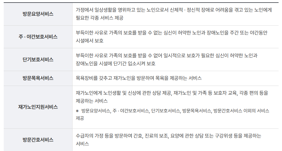 - 더 자세한 정보는 노인장기요양보험 또는 관할 복지센터에서 확인할 수 있습니다.