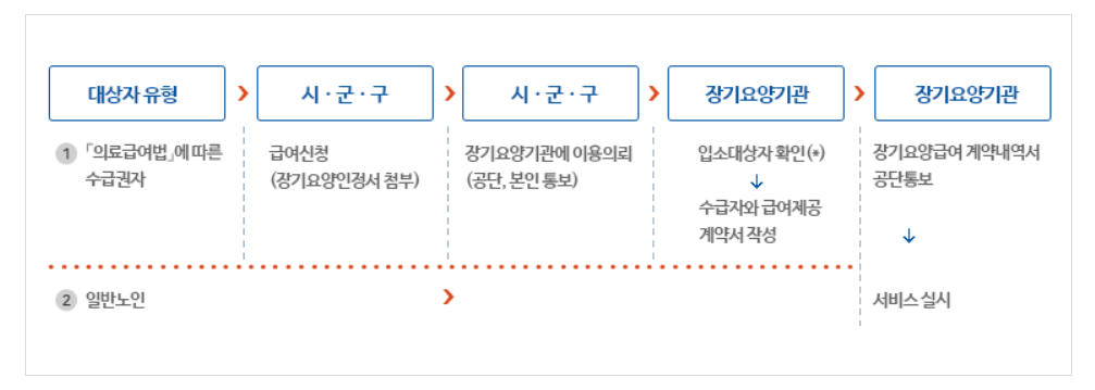 - 장기요양인정신청(공단 지사) → 방문조사 → 등급판정위원회 → 장기요양인정서 수령 → 아래 입소 절차에 따라 입소