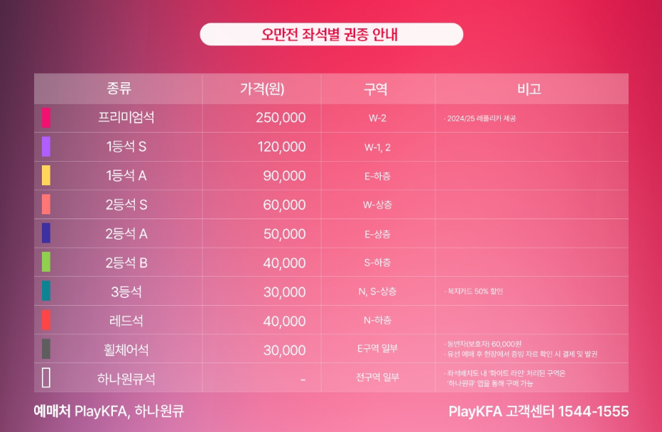 - 예매는 PlayKFA 웹사이트와 PlayKFA 애플리케이션을 통해 진행되며, 일부 좌석은 하나은행 모바일 애플리케이션 하나원큐에서도 구매할 수 있습니다