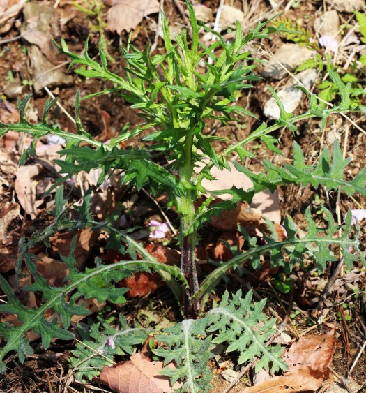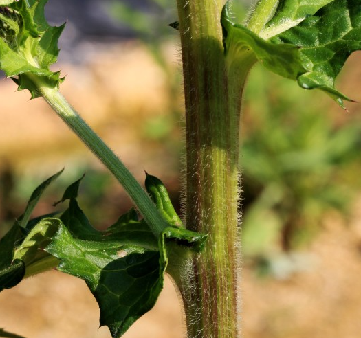 줄기 전체에 거미줄 같은 흰 털이 많고 서서 자랍니다. 잎은 길쭉하게 생겼는데 잎줄기를 중심으로 양옆으로 작은 잎이 6-7쌍씩 갈라져서 나있습니다. 잎 가장자리에 거친 톱니 모양이고 크고 작은 가시가 있습니다.